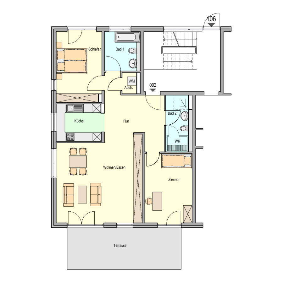 Zur Wohnung gehört eine große Terrasse mit Gartenanteil, zwei Badezimmer sowie ein Abstellraum.